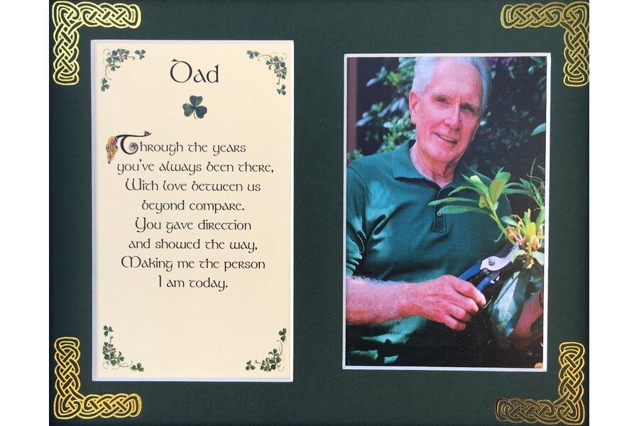 Features - Our blessings printed on ivory card are presented in a forest green matting with gold Celtic knots embossed on the corners. The opening holds a 4x6 photo. Each matt comes in a resealable sleeve.