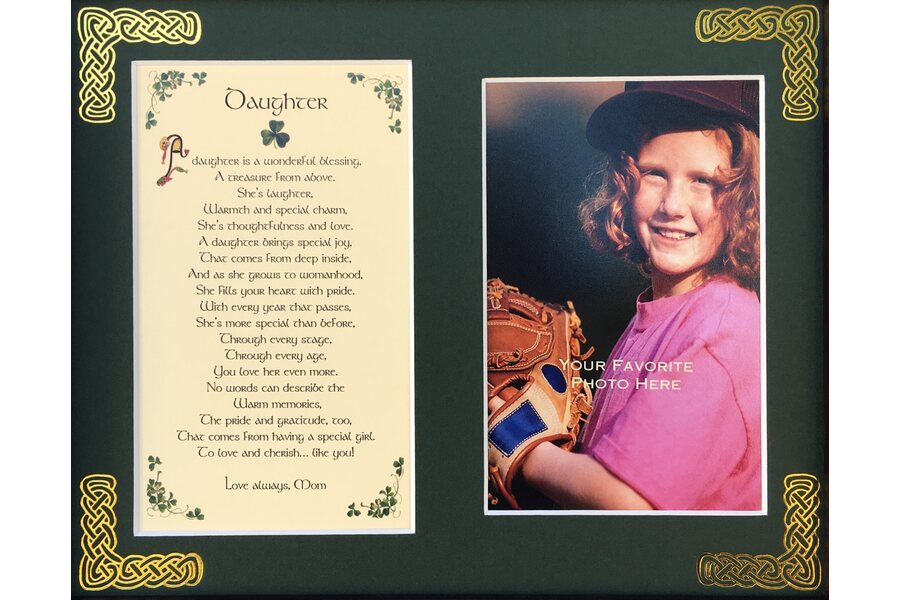 Features - Our blessings printed on ivory card are presented in a forest green matting with gold Celtic knots embossed on the corners. The opening holds a 4x6 photo. Each matt comes in a resealable sleeve.