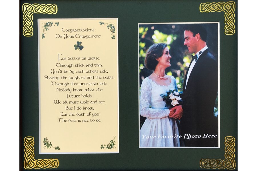 Features - Our blessings printed on ivory card are presented in a forest green matting with gold Celtic knots embossed on the corners. The opening holds a 4x6 photo. Each matt comes in a resealable sleeve.
