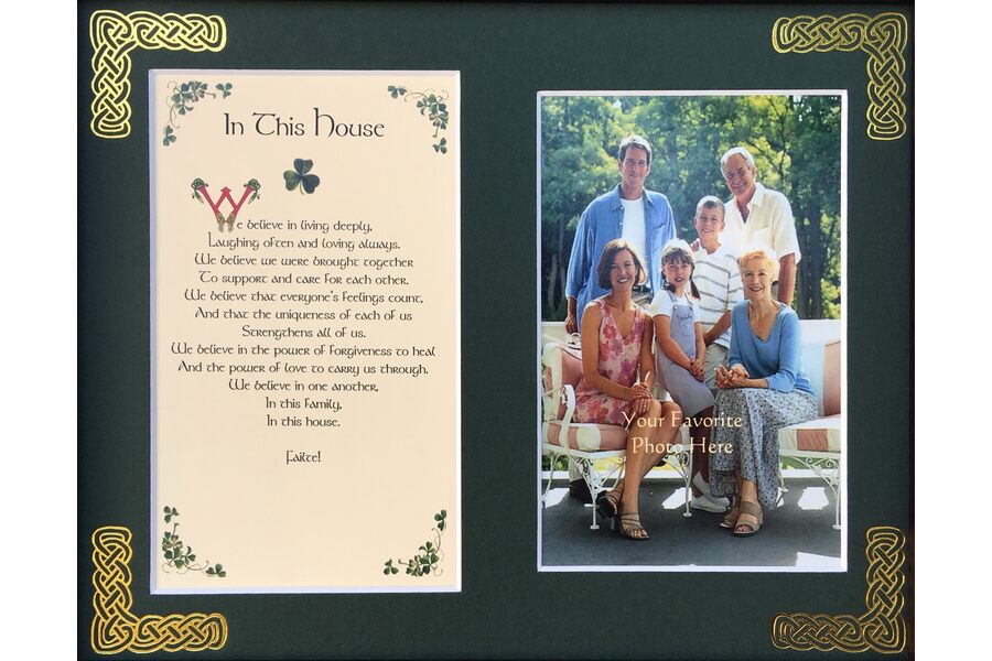 Features - Our blessings printed on ivory card are presented in a forest green matting with gold Celtic knots embossed on the corners. The opening holds a 4x6 photo. Each matt comes in a resealable sleeve.