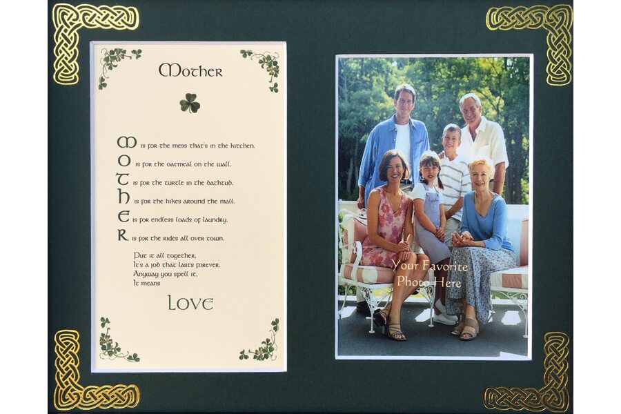 Features - Our blessings printed on ivory card are presented in a forest green matting with gold Celtic knots embossed on the corners. The opening holds a 4x6 photo. Each matt comes in a resealable sleeve.