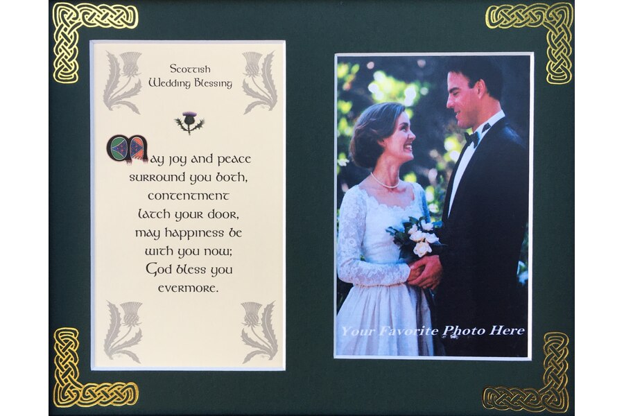 Features - Our blessings printed on ivory card are presented in a forest green matting with gold Celtic knots embossed on the corners. The opening holds a 4x6 photo. Each matt comes in a resealable sleeve.