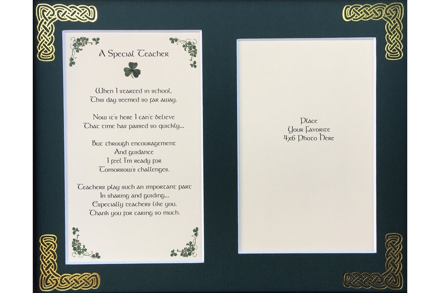 Features - Our blessings printed on ivory card are presented in a forest green matting with gold Celtic knots embossed on the corners. The opening holds a 4x6 photo. Each matt comes in a resealable sleeve.