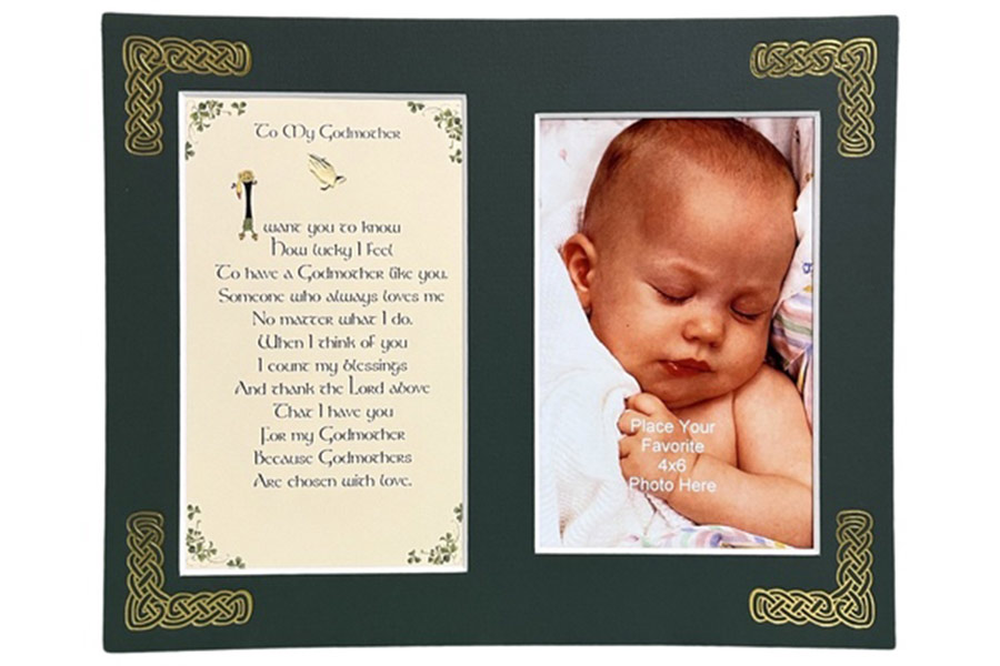 Features - Our blessings printed on ivory card are presented in a forest green matting with gold Celtic knots embossed on the corners. The opening holds a 4x6 photo. Each matt comes in a resealable sleeve.