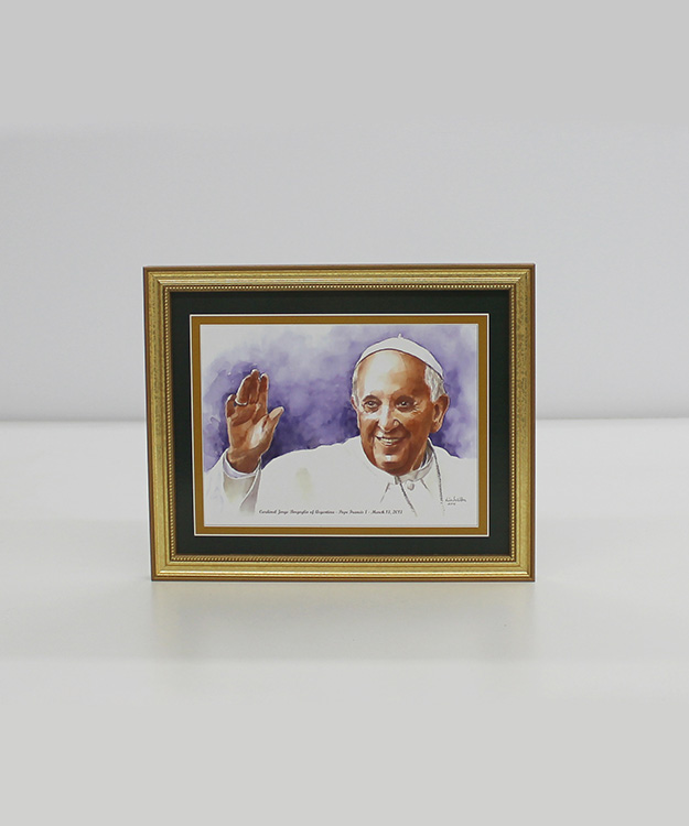 This 8"x10" watercolor print comes in a gold gilt wood frame behind plexiglass and has a wall hanging hook for easy display. The green over gold matting is printed directly on to the print. The ornate detail and high quality wrap of this solid wood frame showcase a rich gold finish. High-quality printing gives this fine art print its vivid and sharp appearance. Produced on heavy weight cover stock, this art reproduction is coated with a silken finish that protects the inks and creates an elegant look.
