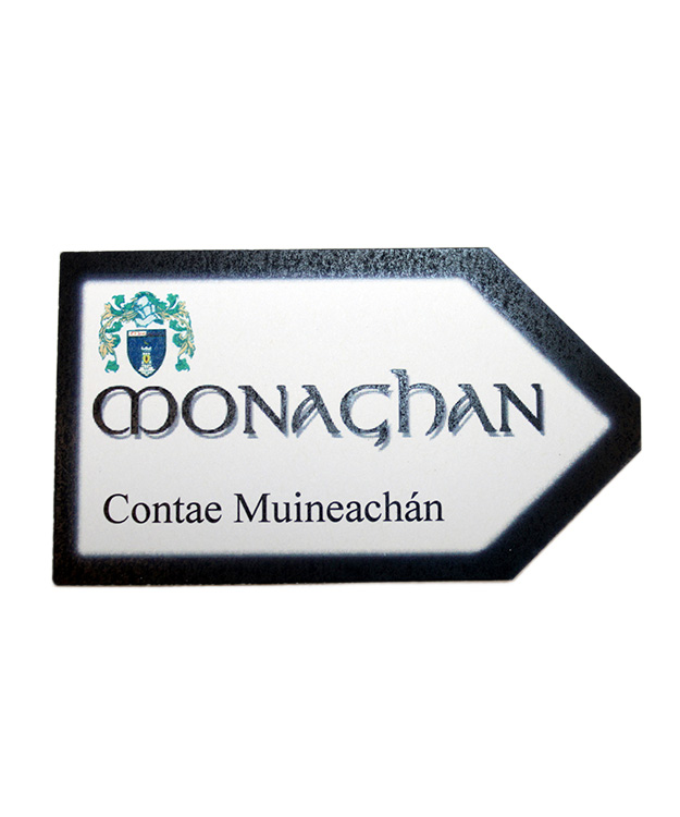Monaghan County Road Sign Magnet - with Gaelic translation & County Coat of Arms - Individually packaged in hanging display bag.
