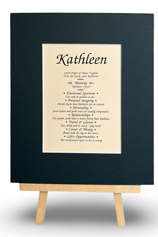 This beautiful, matted print displayed in a forest green matt is printed on an ivory card stock, text includes the local origin of the name, meaning, emotional spectrum, personal integrity, personality, relationships, travel & leisure, career & money, life's opportunities, played in a resealable display bag with a backing board. Each name meaning print has its name and number secured to the corner with a sticker, names have an A-Z dividers for easy searching of a specific name. We also take special orders for those hard to find names. Any name any spelling.