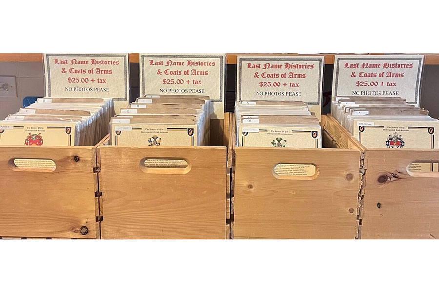Each parchment card stock print has the Coat of Arms and History placed in a secure sleeve, at the top left corner is a number last name for easy restock.