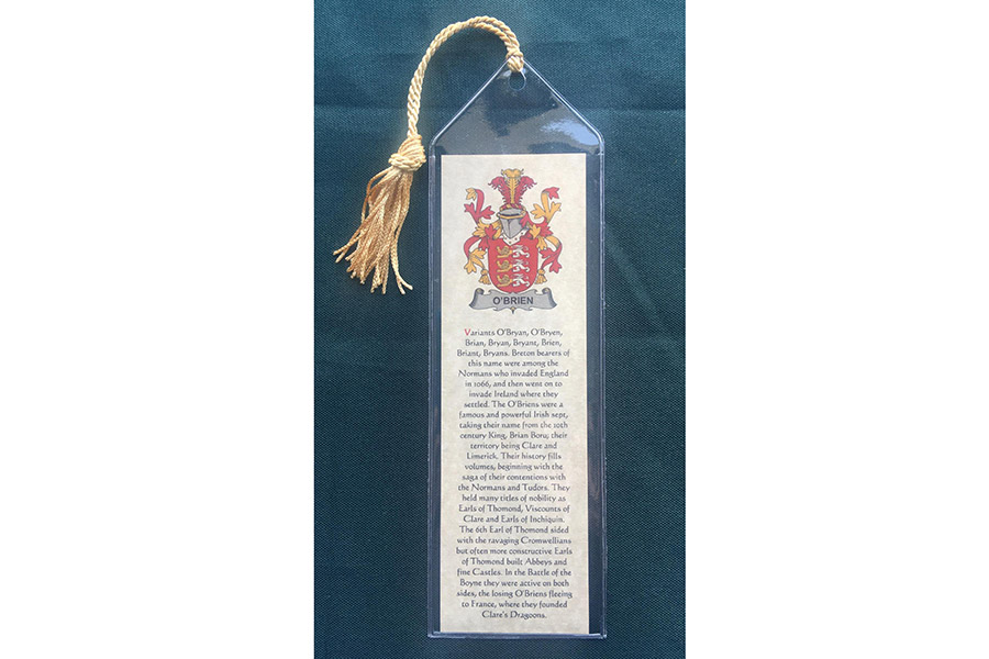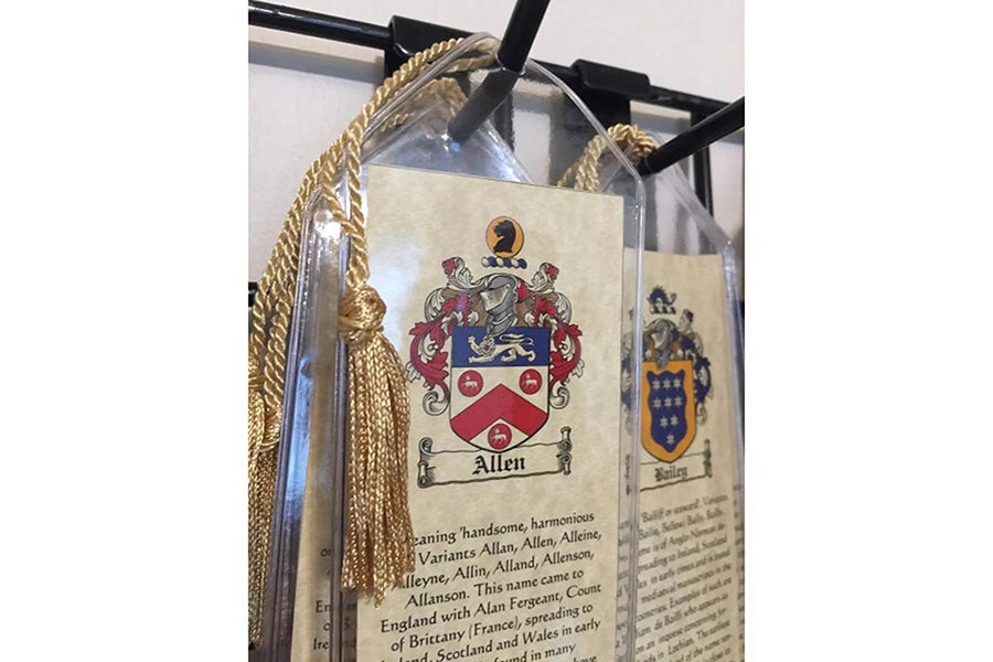 Each handmade book mark has the Coat of Arms and History on a aged parchment card stock placed in a secure vinyl bookmark sleeve, at the top is a hole with an attached gold thread tassel.