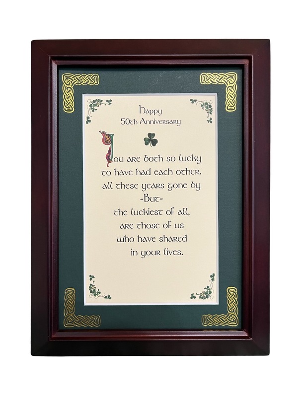 Features - Our blessings are printed on an ivory card, and are presented in a forest green matting with gold Celtic knots, embossed on the corners. Set behind glass and displayed in an elegant dark walnut frame of Italian design. The backing has a hanger and an attached easel to allow for both wall and tabletop display. Each frame comes individually boxed in a bubble wrap sleeve.