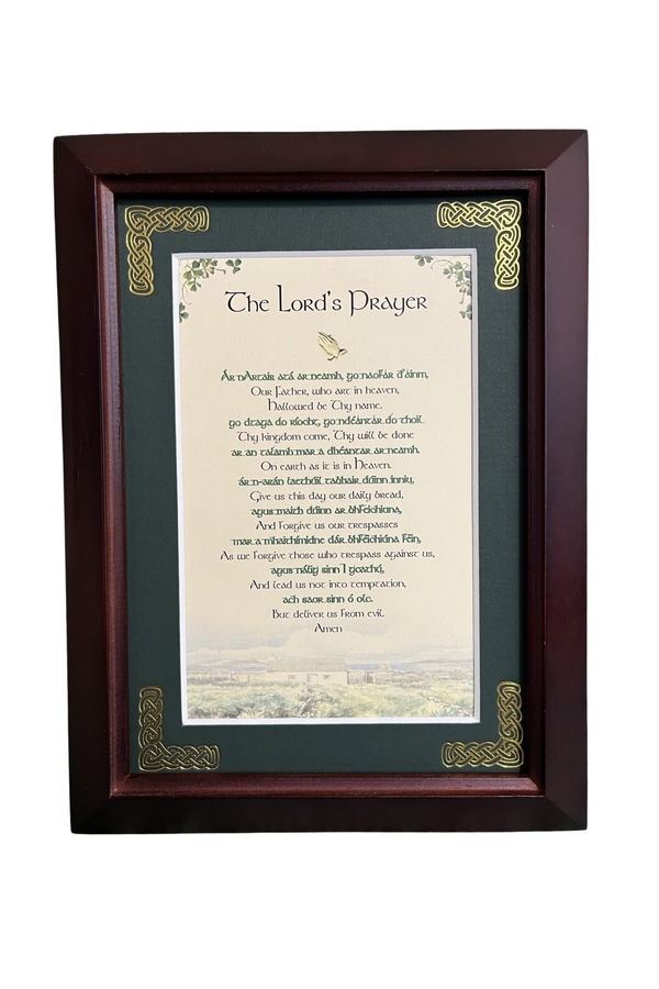 Features - Our blessings are printed on an ivory card, and are presented in a forest green matting with gold Celtic knots, embossed on the corners. Set behind glass and displayed in an elegant dark walnut frame of Italian design. The backing has a hanger and an attached easel to allow for both wall and tabletop display. Each frame comes individually boxed in a bubble wrap sleeve.