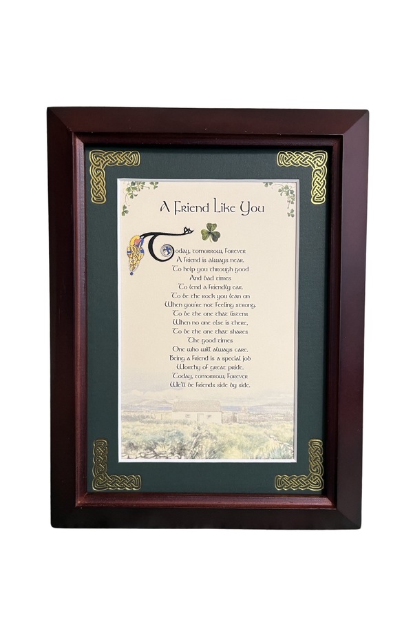 Features - Our blessings are printed on an ivory card, and are presented in a forest green matting with gold Celtic knots, embossed on the corners. Set behind glass and displayed in an elegant dark walnut frame of Italian design. The backing has a hanger and an attached easel to allow for both wall and tabletop display. Each frame comes individually boxed in a bubble wrap sleeve.