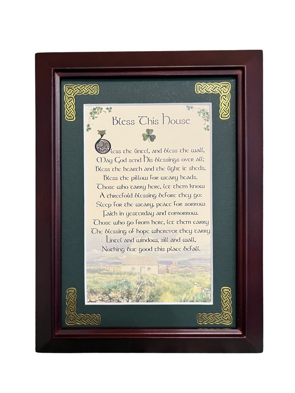 Features - Our blessings are printed on an ivory card, and are presented in a forest green matting with gold Celtic knots, embossed on the corners. Set behind glass and displayed in an elegant dark walnut frame of Italian design. The backing has a hanger and an attached easel to allow for both wall and tabletop display. Each frame comes individually boxed in a bubble wrap sleeve.