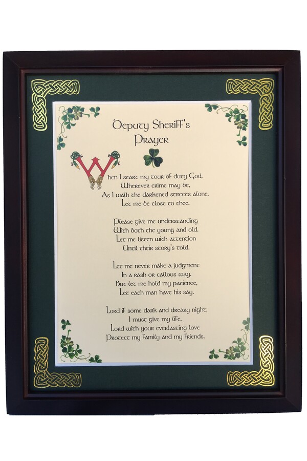 Features - Our blessings are printed on ivory card, and are presented in a forest green matting with gold Celtic knots embossed on the corners. Set behind glass and displayed in a elegant dark walnut frame of Italian design. The backing has a hanger and an attached easel to allow for both wall and tabletop display. Each frame comes individually boxed in a bubble wrap sleeve.