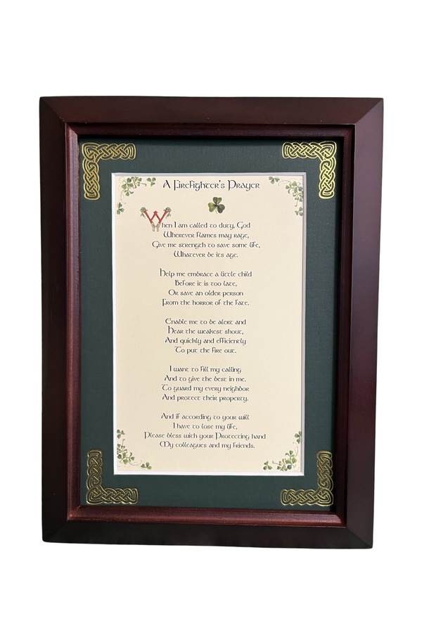 Features - Our blessings are printed on an ivory card, and are presented in a forest green matting with gold Celtic knots, embossed on the corners. Set behind glass and displayed in an elegant dark walnut frame of Italian design. The backing has a hanger and an attached easel to allow for both wall and tabletop display. Each frame comes individually boxed in a bubble wrap sleeve.