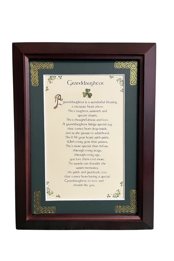 Features - Our blessings are printed on an ivory card, and are presented in a forest green matting with gold Celtic knots, embossed on the corners. Set behind glass and displayed in an elegant dark walnut frame of Italian design. The backing has a hanger and an attached easel to allow for both wall and tabletop display. Each frame comes individually boxed in a bubble wrap sleeve.