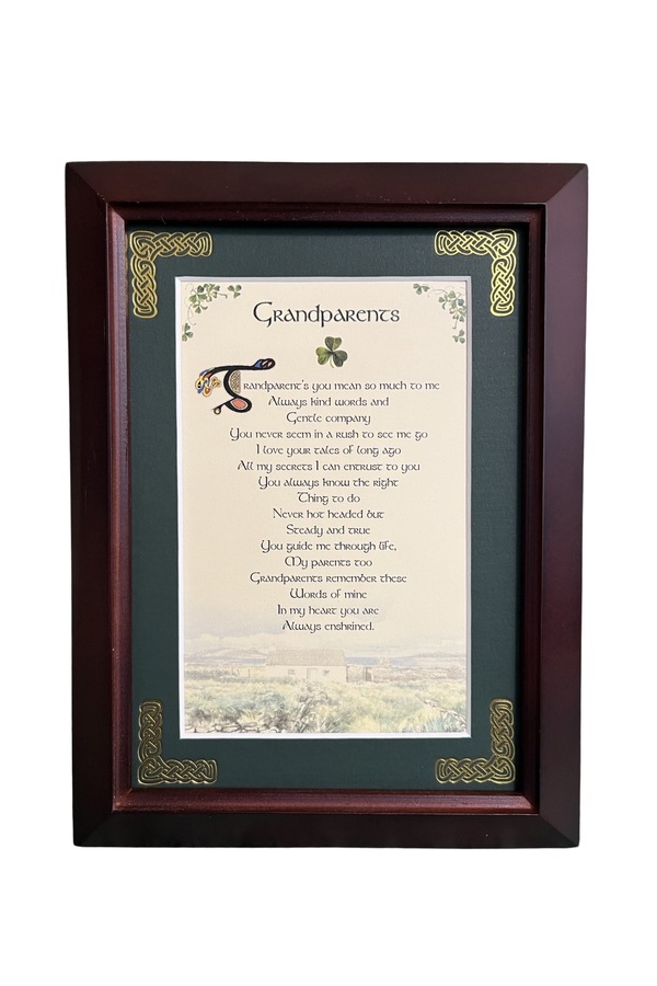 Features - Our blessings are printed on an ivory card, and are presented in a forest green matting with gold Celtic knots, embossed on the corners. Set behind glass and displayed in an elegant dark walnut frame of Italian design. The backing has a hanger and an attached easel to allow for both wall and tabletop display. Each frame comes individually boxed in a bubble wrap sleeve.