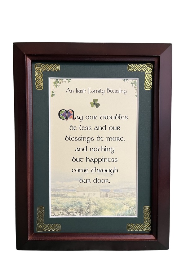 Features - Our blessings are printed on an ivory card, and are presented in a forest green matting with gold Celtic knots, embossed on the corners. Set behind glass and displayed in an elegant dark walnut frame of Italian design. The backing has a hanger and an attached easel to allow for both wall and tabletop display. Each frame comes individually boxed in a bubble wrap sleeve.