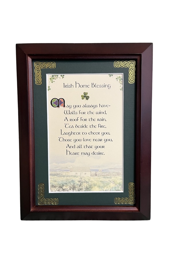 Features - Our blessings are printed on an ivory card, and are presented in a forest green matting with gold Celtic knots, embossed on the corners. Set behind glass and displayed in an elegant dark walnut frame of Italian design. The backing has a hanger and an attached easel to allow for both wall and tabletop display. Each frame comes individually boxed in a bubble wrap sleeve.
