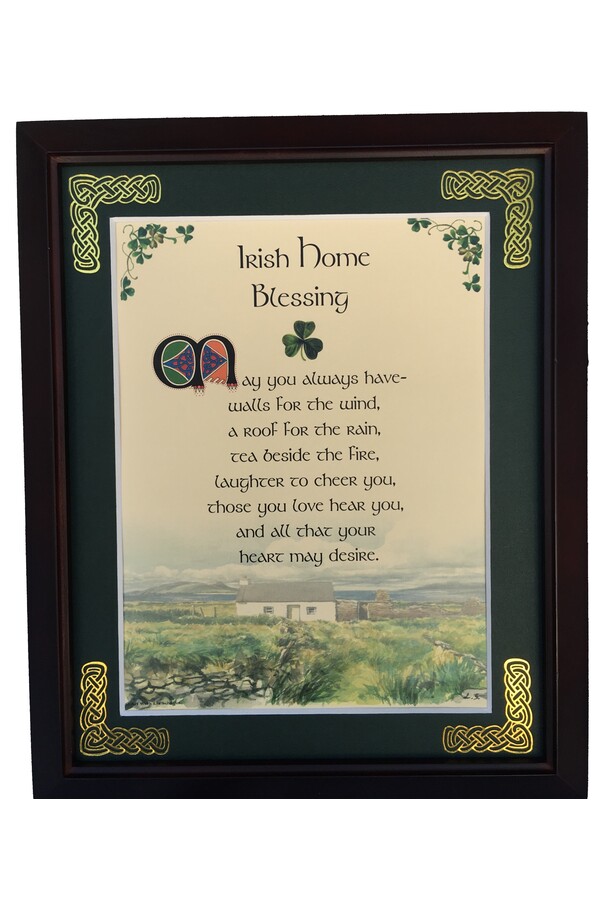 Features - Our blessings are printed on ivory card, and are presented in a forest green matting with gold Celtic knots embossed on the corners. Set behind glass and displayed in a elegant dark walnut frame of Italian design. The backing has a hanger and an attached easel to allow for both wall and tabletop display. Each frame comes individually boxed in a bubble wrap sleeve.