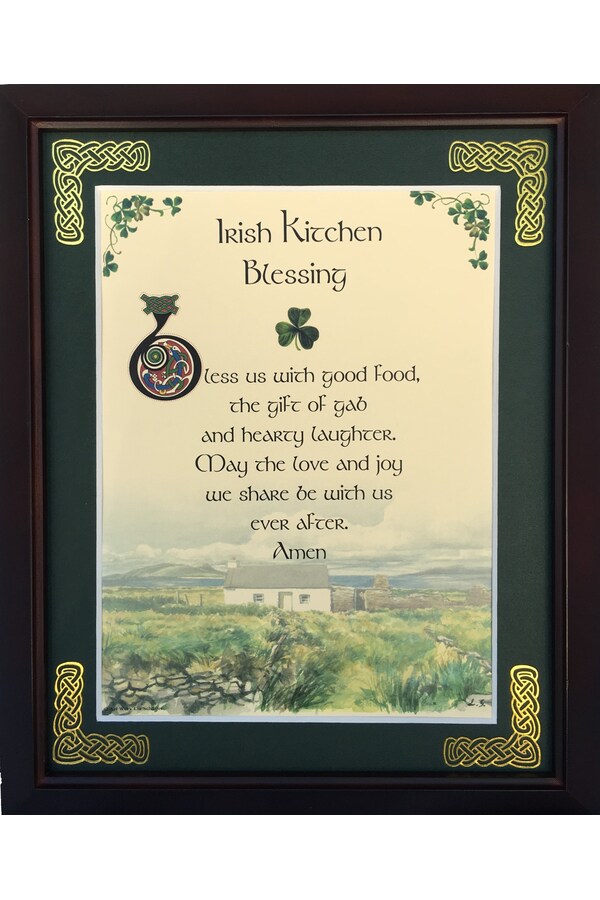 Features - Our blessings are printed on ivory card, and are presented in a forest green matting with gold Celtic knots embossed on the corners. Set behind glass and displayed in a elegant dark walnut frame of Italian design. The backing has a hanger and an attached easel to allow for both wall and tabletop display. Each frame comes individually boxed in a bubble wrap sleeve.