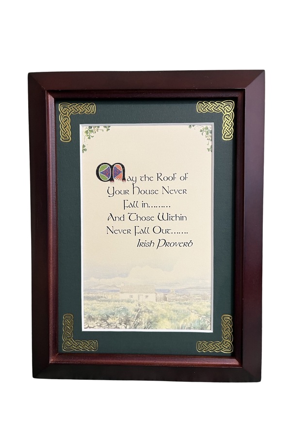 Features - Our blessings are printed on an ivory card, and are presented in a forest green matting with gold Celtic knots, embossed on the corners. Set behind glass and displayed in an elegant dark walnut frame of Italian design. The backing has a hanger and an attached easel to allow for both wall and tabletop display. Each frame comes individually boxed in a bubble wrap sleeve.