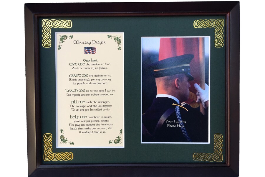 Features - Our blessings are printed on ivory card, and are presented in a forest green matting with gold Celtic knots embossed on the corners. Set behind glass and displayed in a elegant dark walnut frame of Italian design. The backing has a hanger and an attached easel to allow for both wall and table top display. The opening holds a 4x6 photo. Each frame comes individually boxed in a bubble wrap sleeve.