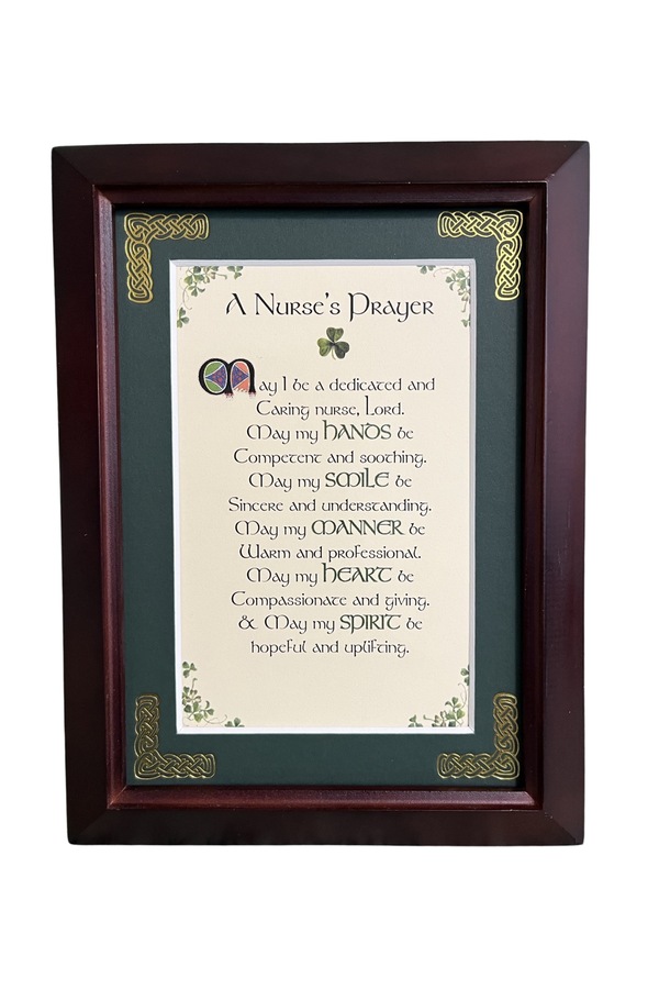 Features - Our blessings are printed on an ivory card, and are presented in a forest green matting with gold Celtic knots, embossed on the corners. Set behind glass and displayed in an elegant dark walnut frame of Italian design. The backing has a hanger and an attached easel to allow for both wall and tabletop display. Each frame comes individually boxed in a bubble wrap sleeve.
