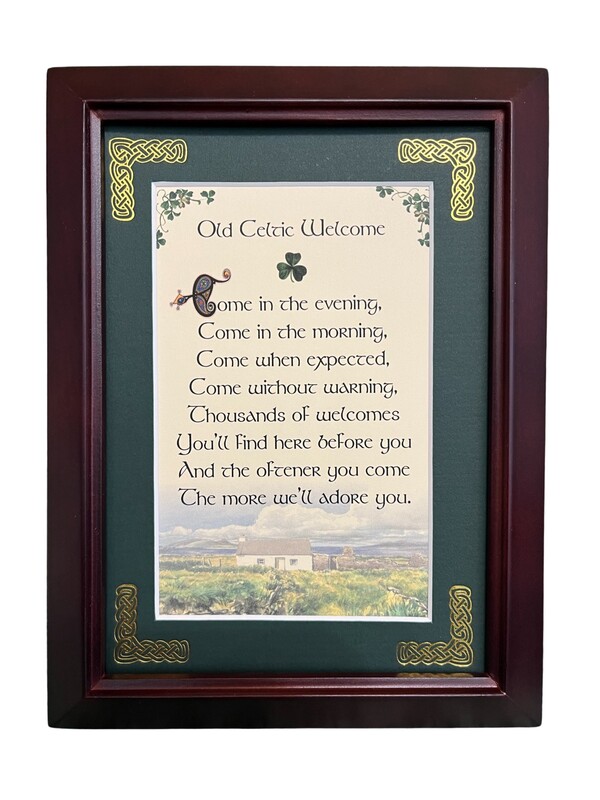 Features - Our blessings are printed on an ivory card, and are presented in a forest green matting with gold Celtic knots, embossed on the corners. Set behind glass and displayed in an elegant dark walnut frame of Italian design. The backing has a hanger and an attached easel to allow for both wall and tabletop display. Each frame comes individually boxed in a bubble wrap sleeve.