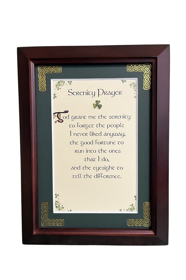 Features - Our blessings are printed on an ivory card, and are presented in a forest green matting with gold Celtic knots, embossed on the corners. Set behind glass and displayed in an elegant dark walnut frame of Italian design. The backing has a hanger and an attached easel to allow for both wall and tabletop display. Each frame comes individually boxed in a bubble wrap sleeve.