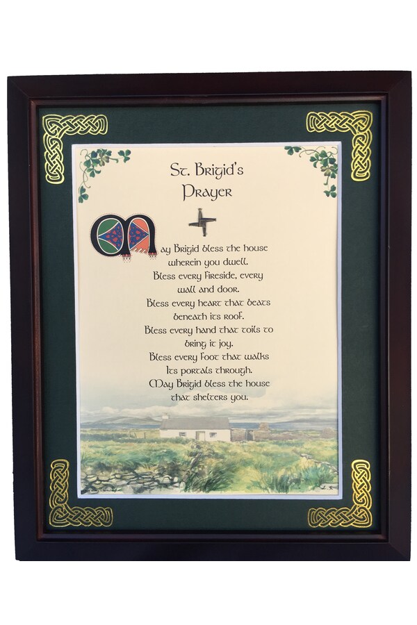 Features - Our blessings are printed on ivory card, and are presented in a forest green matting with gold Celtic knots embossed on the corners. Set behind glass and displayed in a elegant dark walnut frame of Italian design. The backing has a hanger and an attached easel to allow for both wall and tabletop display. Each frame comes individually boxed in a bubble wrap sleeve.