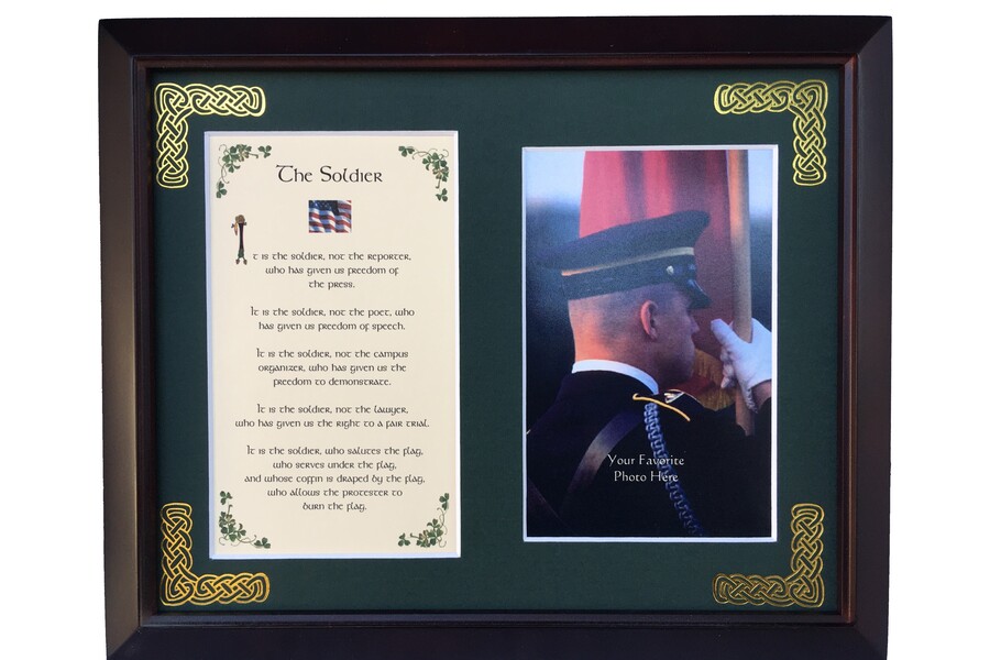 Features - Our blessings are printed on ivory card, and are presented in a forest green matting with gold Celtic knots embossed on the corners. Set behind glass and displayed in a elegant dark walnut frame of Italian design. The backing has a hanger and an attached easel to allow for both wall and table top display. The opening holds a 4x6 photo. Each frame comes individually boxed in a bubble wrap sleeve.