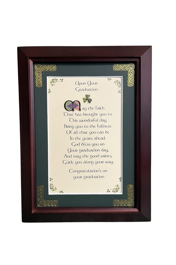 Features - Our blessings are printed on an ivory card, and are presented in a forest green matting with gold Celtic knots, embossed on the corners. Set behind glass and displayed in an elegant dark walnut frame of Italian design. The backing has a hanger and an attached easel to allow for both wall and tabletop display. Each frame comes individually boxed in a bubble wrap sleeve.