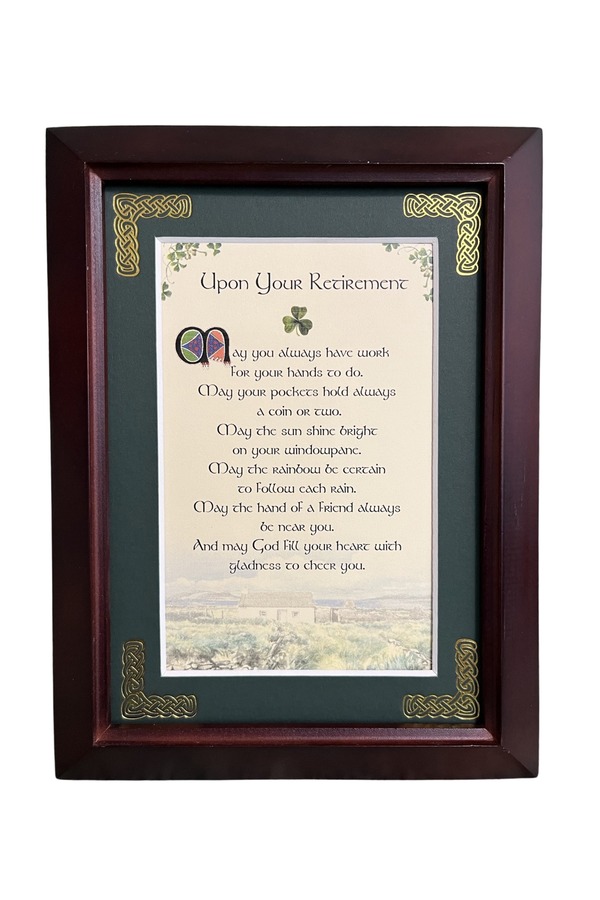 Features - Our blessings are printed on an ivory card, and are presented in a forest green matting with gold Celtic knots, embossed on the corners. Set behind glass and displayed in an elegant dark walnut frame of Italian design. The backing has a hanger and an attached easel to allow for both wall and tabletop display. Each frame comes individually boxed in a bubble wrap sleeve.