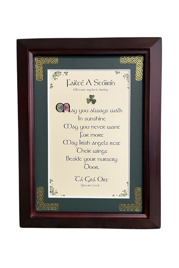 Features - Our blessings are printed on an ivory card, and are presented in a forest green matting with gold Celtic knots, embossed on the corners. Set behind glass and displayed in an elegant dark walnut frame of Italian design. The backing has a hanger and an attached easel to allow for both wall and tabletop display. Each frame comes individually boxed in a bubble wrap sleeve.