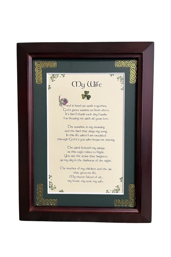 Features - Our blessings are printed on an ivory card, and are presented in a forest green matting with gold Celtic knots, embossed on the corners. Set behind glass and displayed in an elegant dark walnut frame of Italian design. The backing has a hanger and an attached easel to allow for both wall and tabletop display. Each frame comes individually boxed in a bubble wrap sleeve.
