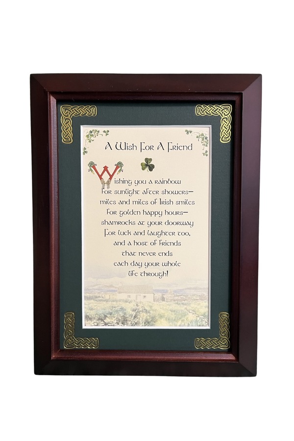 Features - Our blessings are printed on an ivory card, and are presented in a forest green matting with gold Celtic knots, embossed on the corners. Set behind glass and displayed in an elegant dark walnut frame of Italian design. The backing has a hanger and an attached easel to allow for both wall and tabletop display. Each frame comes individually boxed in a bubble wrap sleeve.