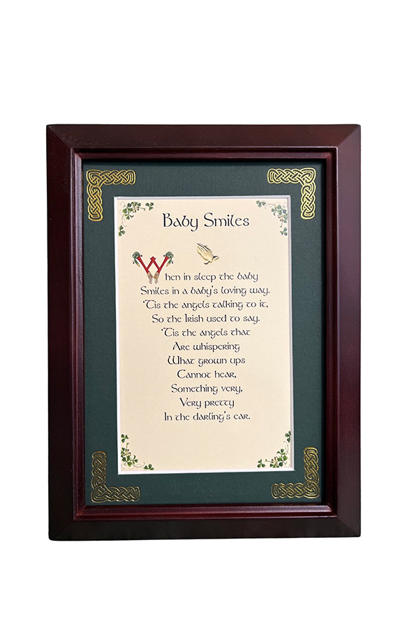 Features - Our blessings are printed on an ivory card, and are presented in a forest green matting with gold Celtic knots, embossed on the corners. Set behind glass and displayed in an elegant dark walnut frame of Italian design. The backing has a hanger and an attached easel to allow for both wall and tabletop display. Each frame comes individually boxed in a bubble wrap sleeve.