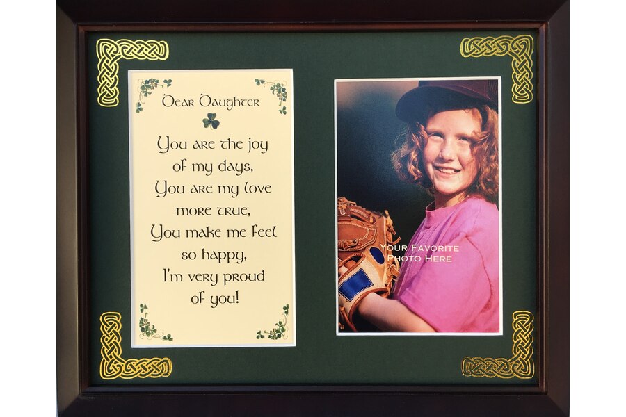 Features - Our blessings are printed on ivory card, and are presented in a forest green matting with gold Celtic knots embossed on the corners. Set behind glass and displayed in a elegant dark walnut frame of Italian design. The backing has a hanger and an attached easel to allow for both wall and table top display. The opening holds a 4x6 photo. Each frame comes individually boxed in a bubble wrap sleeve.