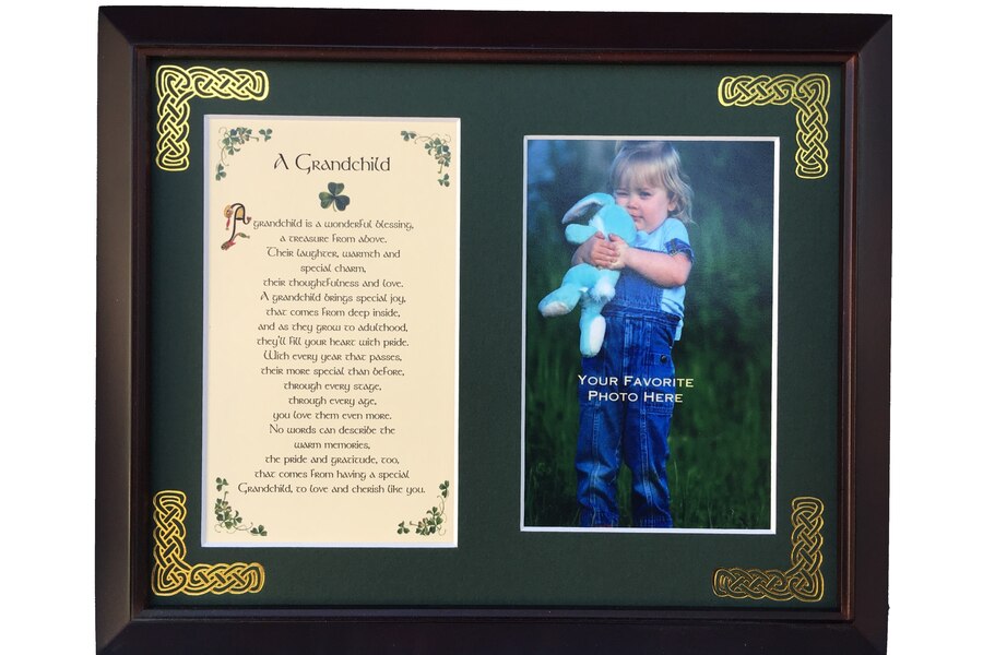 Features - Our blessings are printed on ivory card, and are presented in a forest green matting with gold Celtic knots embossed on the corners. Set behind glass and displayed in a elegant dark walnut frame of Italian design. The backing has a hanger and an attached easel to allow for both wall and table top display. The opening holds a 4x6 photo. Each frame comes individually boxed in a bubble wrap sleeve.