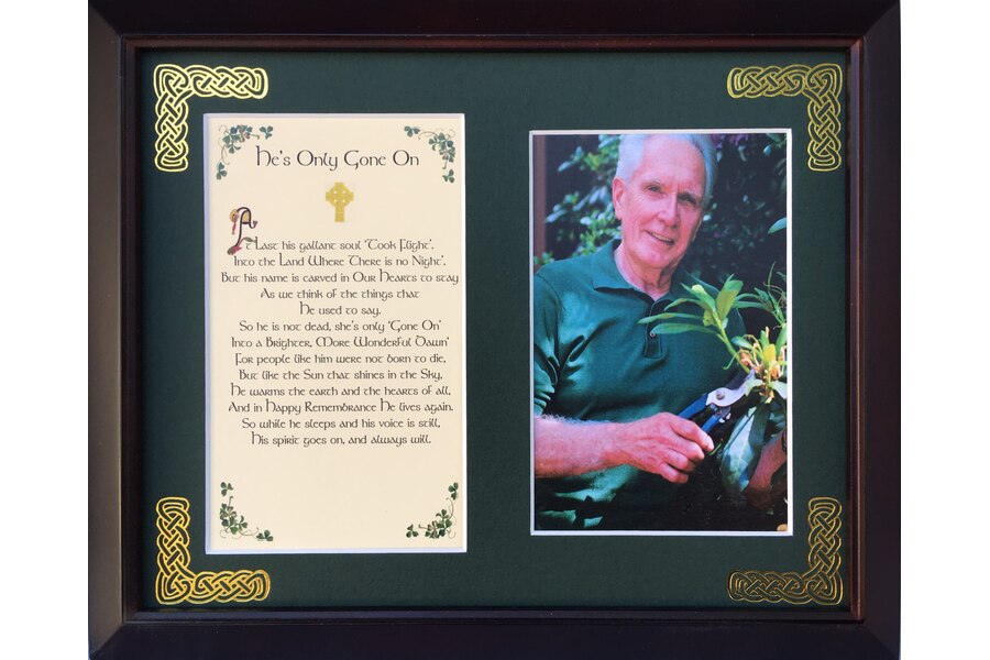 Features - Our blessings are printed on ivory card, and are presented in a forest green matting with gold Celtic knots embossed on the corners. Set behind glass and displayed in a elegant dark walnut frame of Italian design. The backing has a hanger and an attached easel to allow for both wall and table top display. The opening holds a 4x6 photo. Each frame comes individually boxed in a bubble wrap sleeve.