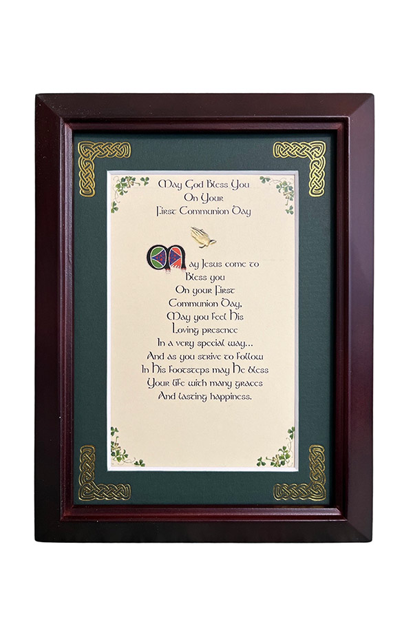 Features - Our blessings are printed on an ivory card, and are presented in a forest green matting with gold Celtic knots, embossed on the corners. Set behind glass and displayed in an elegant dark walnut frame of Italian design. The backing has a hanger and an attached easel to allow for both wall and tabletop display. Each frame comes individually boxed in a bubble wrap sleeve.