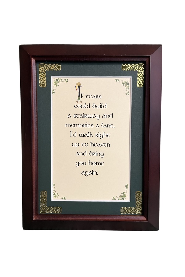 Features - Our blessings are printed on an ivory card, and are presented in a forest green matting with gold Celtic knots, embossed on the corners. Set behind glass and displayed in an elegant dark walnut frame of Italian design. The backing has a hanger and an attached easel to allow for both wall and tabletop display. Each frame comes individually boxed in a bubble wrap sleeve.
