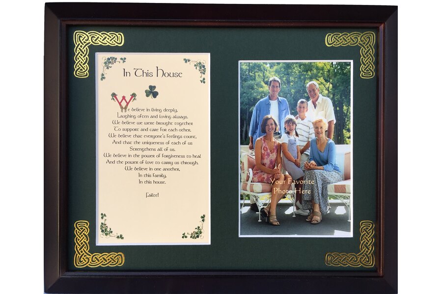 Features - Our blessings are printed on ivory card, and are presented in a forest green matting with gold Celtic knots embossed on the corners. Set behind glass and displayed in a elegant dark walnut frame of Italian design. The backing has a hanger and an attached easel to allow for both wall and table top display. The opening holds a 4x6 photo. Each frame comes individually boxed in a bubble wrap sleeve.