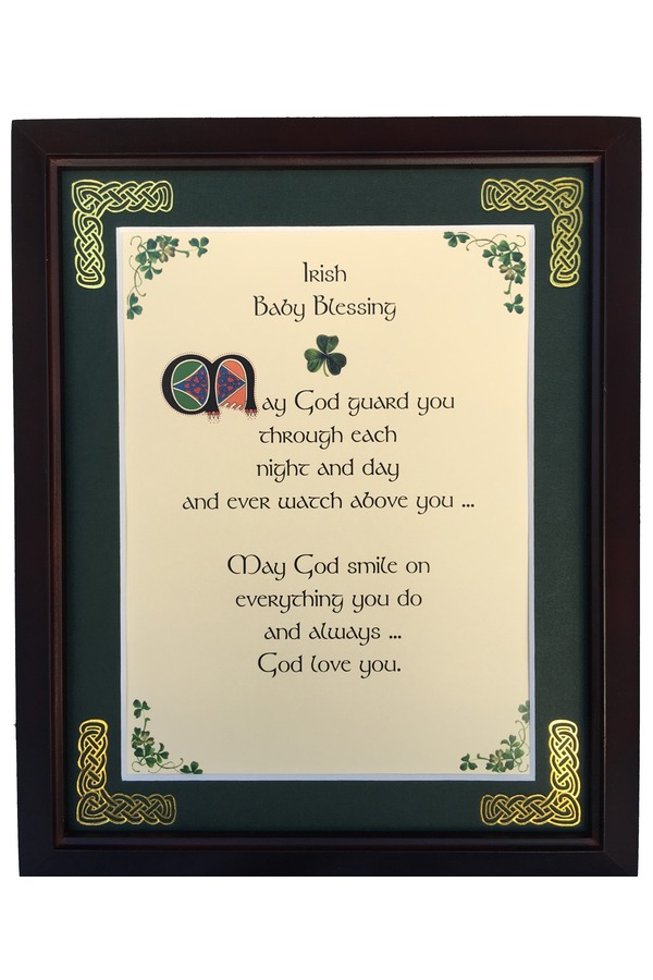 Features - Our blessings are printed on ivory card, and are presented in a forest green matting with gold Celtic knots embossed on the corners. Set behind glass and displayed in a elegant dark walnut frame of Italian design. The backing has a hanger and an attached easel to allow for both wall and tabletop display. Each frame comes individually boxed in a bubble wrap sleeve.