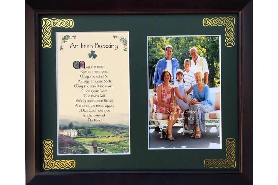 Features - Our blessings are printed on ivory card, and are presented in a forest green matting with gold Celtic knots embossed on the corners. Set behind glass and displayed in a elegant dark walnut frame of Italian design. The backing has a hanger and an attached easel to allow for both wall and table top display. The opening holds a 4x6 photo. Each frame comes individually boxed in a bubble wrap sleeve.
