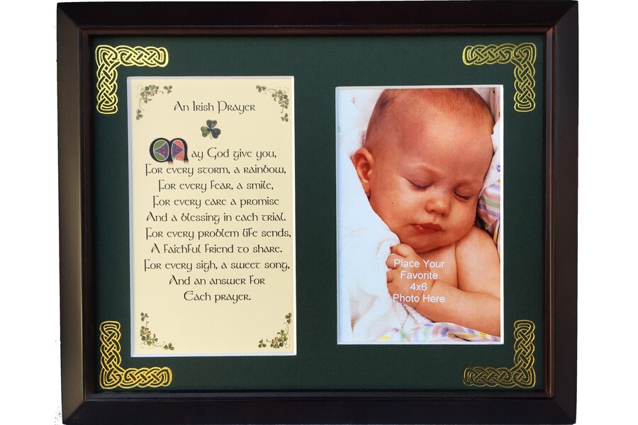 Features - Our blessings are printed on ivory card, and are presented in a forest green matting with gold Celtic knots embossed on the corners. Set behind glass and displayed in a elegant dark walnut frame of Italian design. The backing has a hanger and an attached easel to allow for both wall and table top display. The opening holds a 4x6 photo. Each frame comes individually boxed in a bubble wrap sleeve.