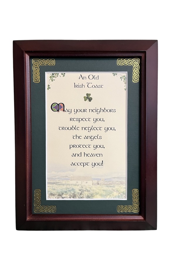 Features - Our blessings are printed on an ivory card, and are presented in a forest green matting with gold Celtic knots, embossed on the corners. Set behind glass and displayed in an elegant dark walnut frame of Italian design. The backing has a hanger and an attached easel to allow for both wall and tabletop display. Each frame comes individually boxed in a bubble wrap sleeve.