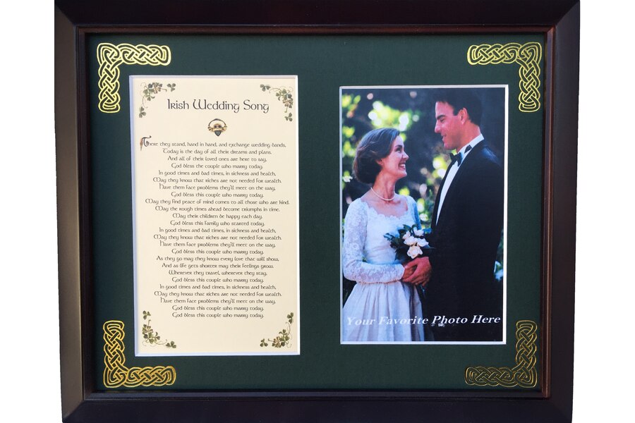 Features - Our blessings are printed on ivory card, and are presented in a forest green matting with gold Celtic knots embossed on the corners. Set behind glass and displayed in a elegant dark walnut frame of Italian design. The backing has a hanger and an attached easel to allow for both wall and table top display. The opening holds a 4x6 photo. Each frame comes individually boxed in a bubble wrap sleeve.