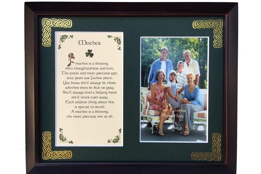 Features - Our blessings are printed on ivory card, and are presented in a forest green matting with gold Celtic knots embossed on the corners. Set behind glass and displayed in a elegant dark walnut frame of Italian design. The backing has a hanger and an attached easel to allow for both wall and table top display. The opening holds a 4x6 photo. Each frame comes individually boxed in a bubble wrap sleeve.